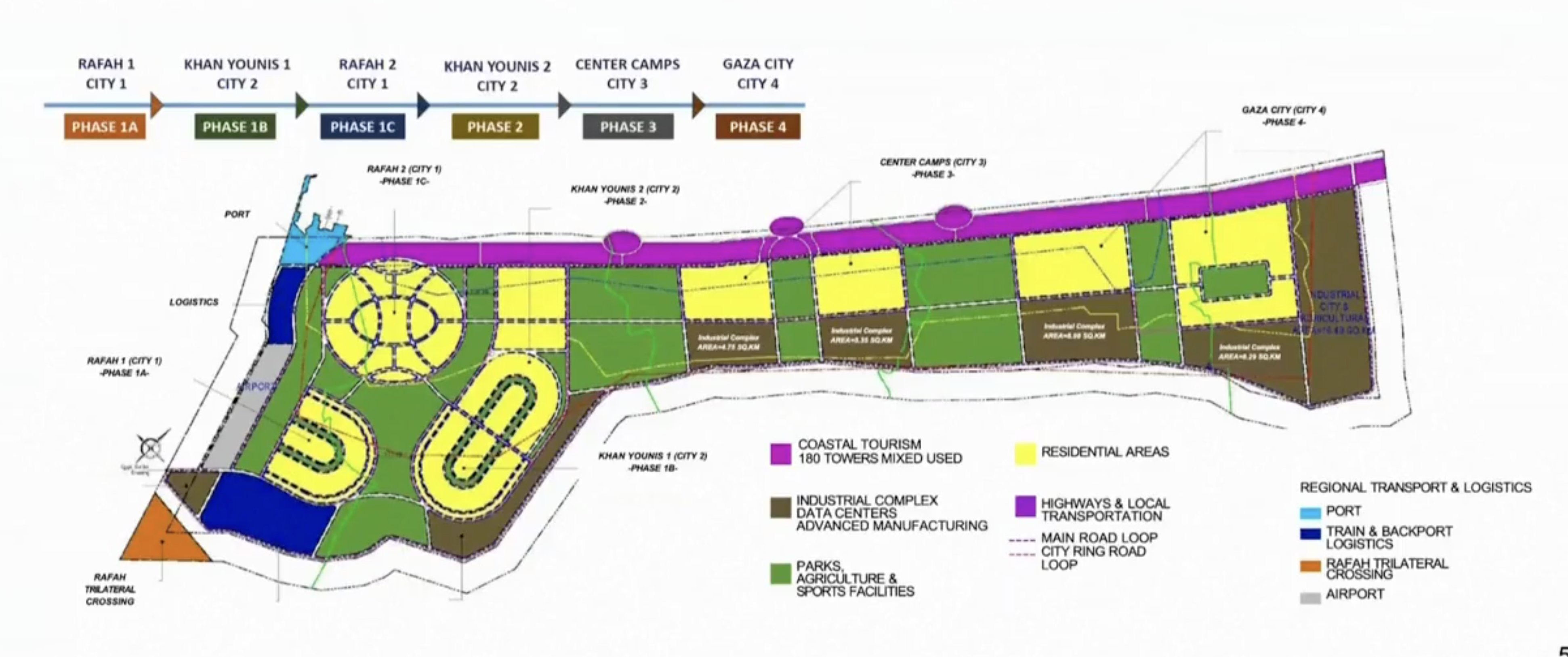 L’intera zona costiera sarà dedicata al turismo. Nell’immediato entroterra sorgeranno le aree residenziali per i palestinesi, intervallate da parchi e zone agricole.